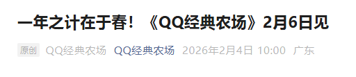据“QQ经典农场”微信公众号此前消息,腾讯《QQ经典农场》将在2月6日回归,同步登陆QQ和微信。