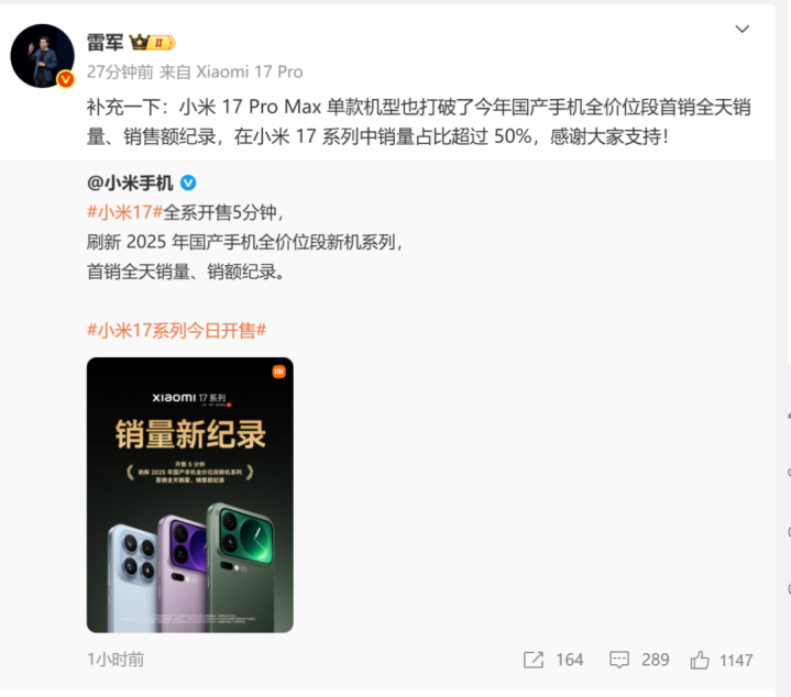 随后小米集团董事长兼CEO雷军表示,小米17ProMax单款机型打破了今年国产手机全价位段首销全天销量、销售额纪录,在小米17系列中销量占比超过50%。