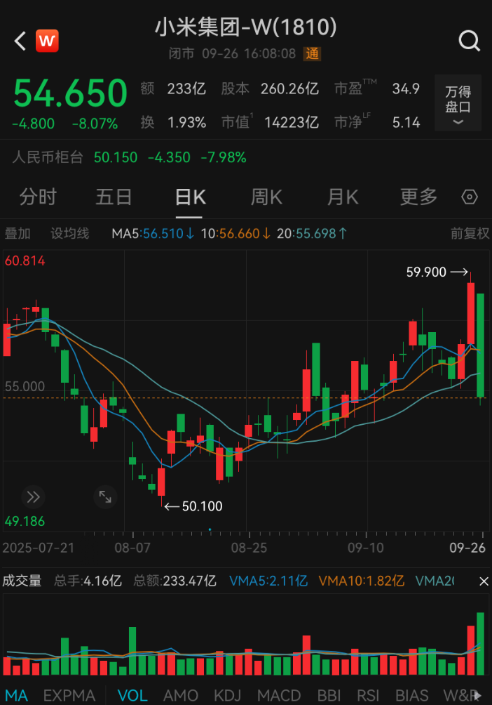 9月26日,小米集团股价开盘后股价持续走低,早盘一度跌超5%,午后跌幅扩大,尾盘一度大跌8.66%。截至收盘,小米集团股价跌幅达8.07%,报54.65港元/股,全天成交金额达233亿港元,市值跌超1000亿港元,目前总市值1.42万亿港元。